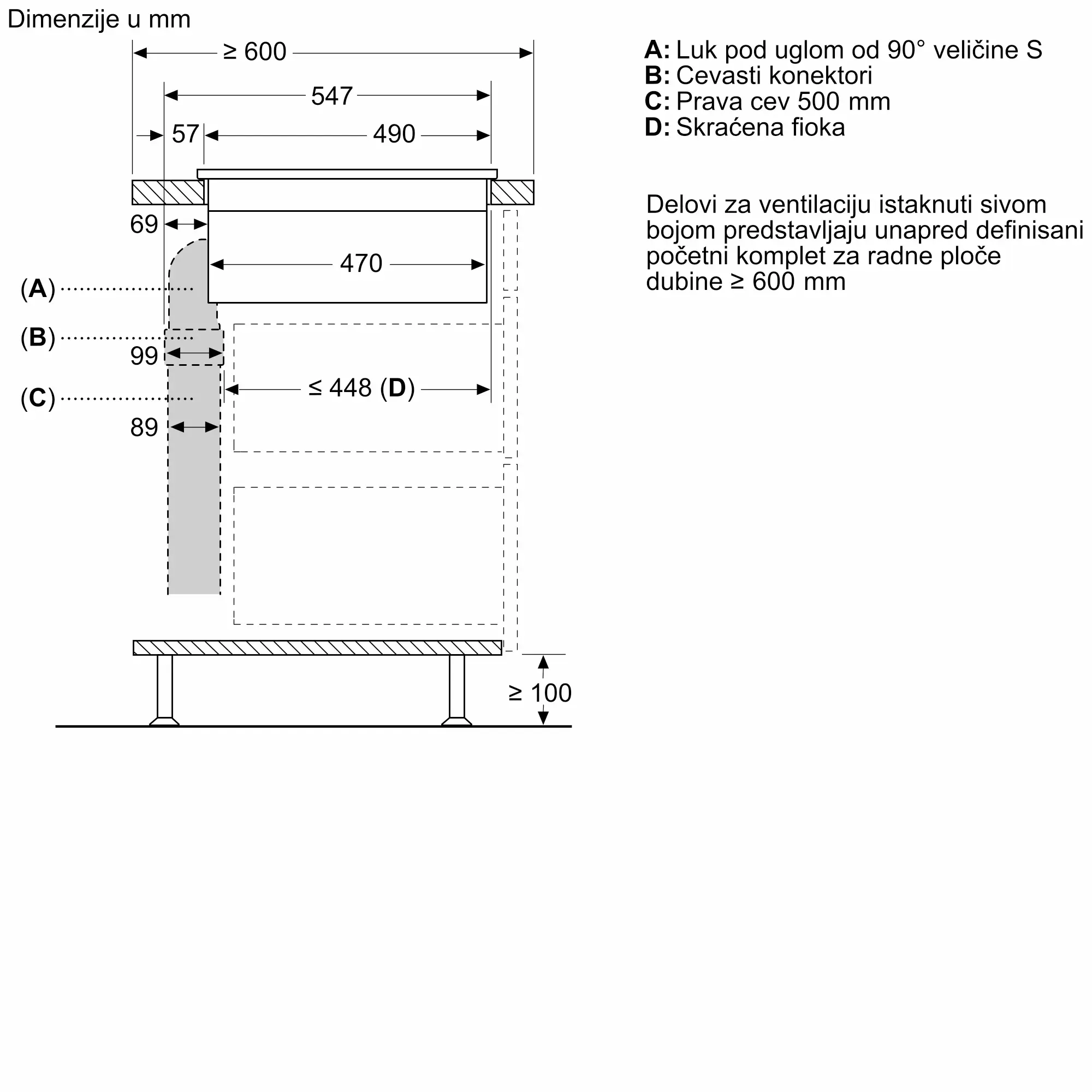 Osnovni komplet dodatnog pribora za konfiguracije odvoda putem cevi vaše ploče za kuvanje sa ugrađenim modulom za ventilaciju u kuhinjama u kojima je radna ploča dubine 60 cm ili više.