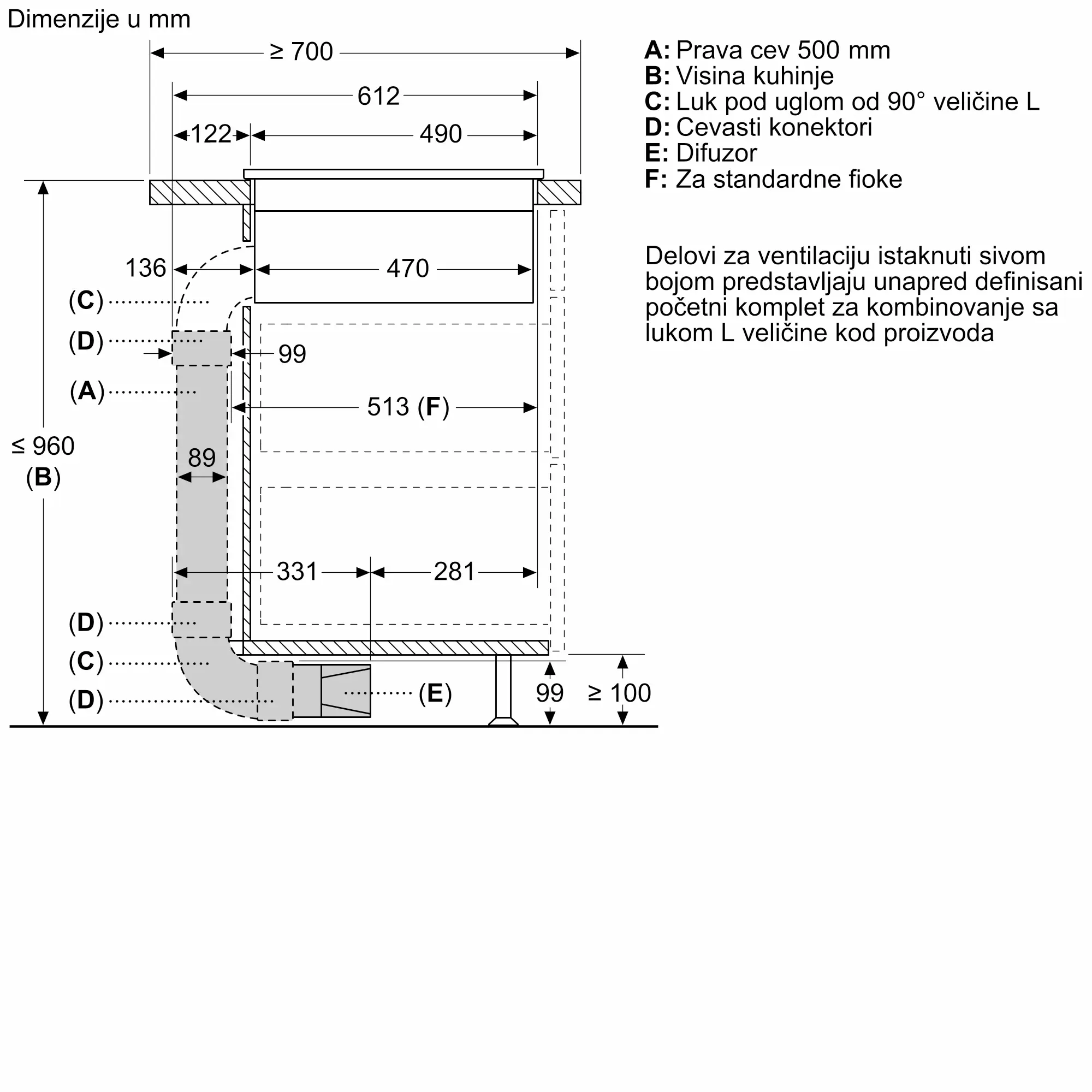Komplet dodatnog pribora za konfiguracije za recirkulaciju delimično putem cevi vaše ploče za kuvanje sa ugrađenim modulom za ventilaciju - koji se koristi u kombinaciji sa prvobitnim zglobnim konektorom za ravnu cev koji se isporučuje sa kompletom aparata.
